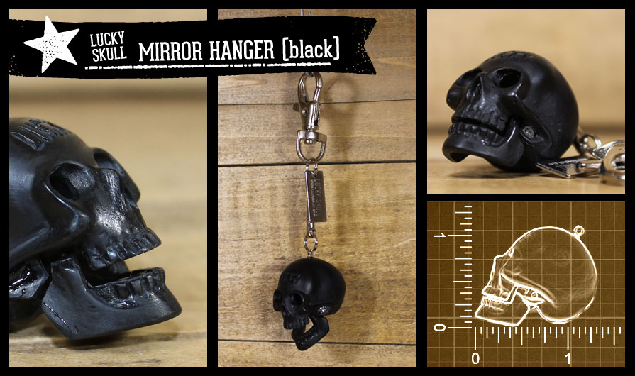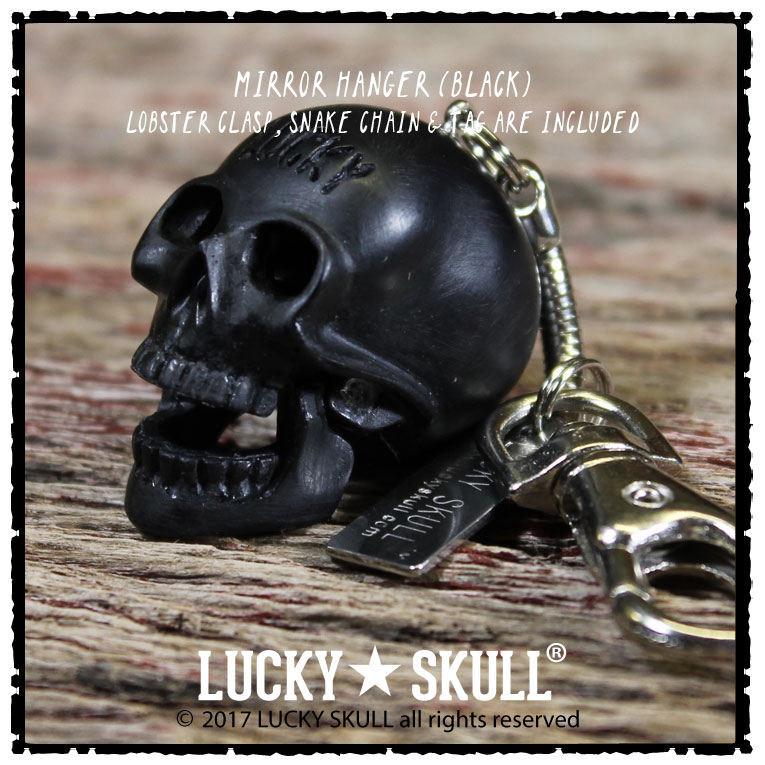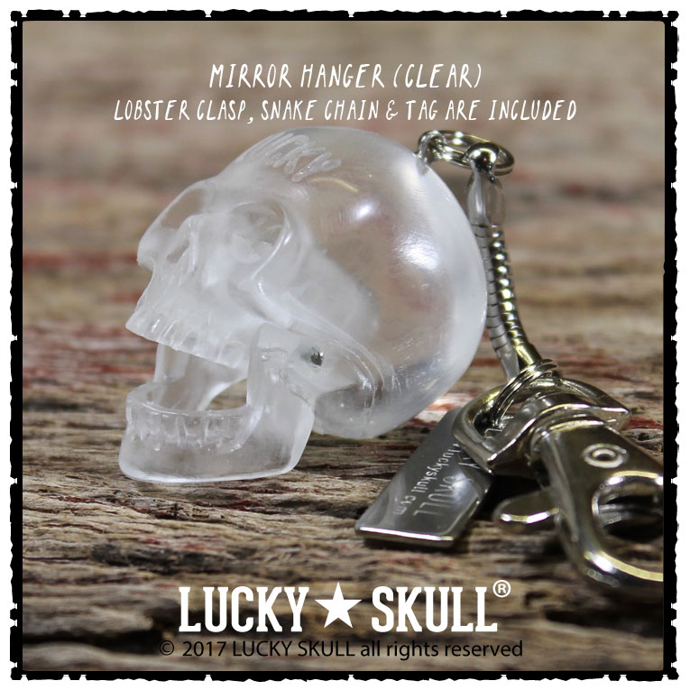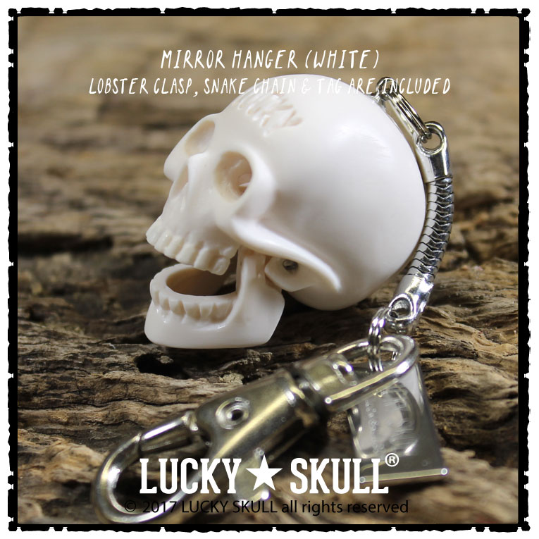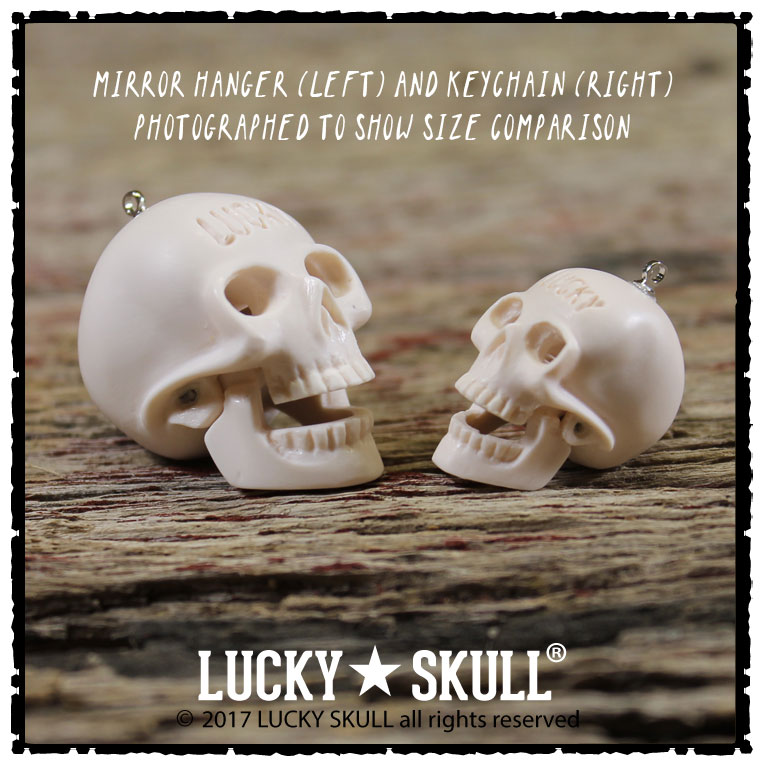 The Lucky Skull mirror hanger is a larger version of the keychain. It is approximately 1.5" and is designed to be hung from your rearview mirror of your car. We attach a 1.5" snake chain and it is attached to a lobster clasp that will hang on any type of cordage or s-biner type of clasp (not included) that is commonly used for mirror hanging applications.